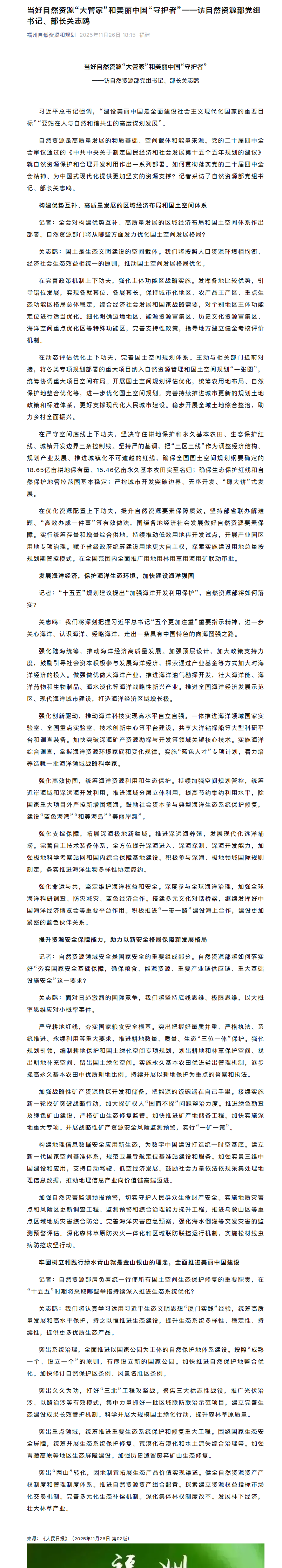 当好自然资源“大管家”和美丽中国“守护者”——访自然资源部党组书记、部长关志鸥